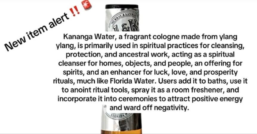 Kananga Water, a fragrant cologne made from ylang ylang, is primarily used in spiritual practices for cleansing, protection, and ancestral work, acting as a spiritual cleanser for homes, objects, and people, an offering for spirits, and an enhancer for luck, love, and prosperity rituals, much like Florida Water. Users add it to baths, use it to anoint ritual tools, spray it as a room freshener, and incorporate it into ceremonies to attract positive energy and ward off negativity.